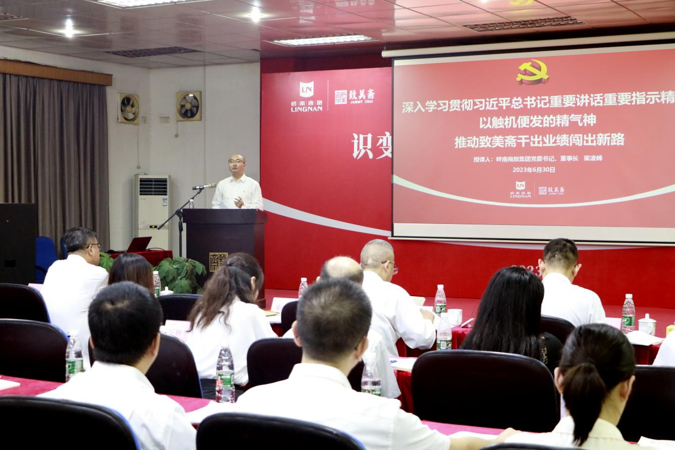 在七一建党102周年来临之际,6月30日上午,岭南商旅集团党委书记、董事长梁凌峰以“深入学习贯彻习近平总书记重要讲话重要指示精神 以触机便发的精气神推动致美斋干出业绩闯出新路”为题,到致美斋作“七一”专题党课。市委主题教育巡回指导组第四组组员李旭到场指导,集团集团党委委员、副总经理李斌和集团党委办公室、行政办公室相关负责人,致美斋领导班子成员、中层管理干部、全体党员等共58人参加。