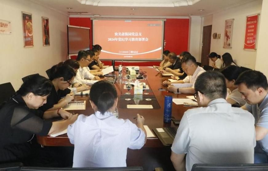 4月24日,致美斋酱园党总支召开党纪学习教育部署会,深入学习贯彻习近平总书记关于党纪学习教育的重要讲话和重要指示精神,并启动部署公司党纪学习教育工作。会议由致美斋酱园党总支副书记庞宗飞主持,党总支书记、董事长周晓炜出席并作部署讲话,公司领导班子成员、党总支委员、各党支部委员,党群工作部、纪检监督室负责人等近20人参加会议。